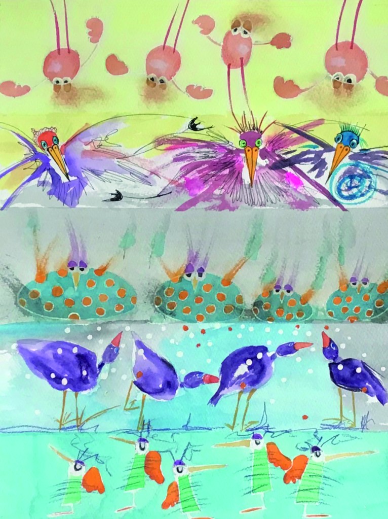 Nécessité d’élaborer un projet commun dans le but de refléter la collaboration, le partage et le plaisir d’être ensemble. Nous avons fait le choix de créer des cadavres exquis, un monde d’oiseaux oniriques et singuliers. Nos oiseaux volent, crient, chantent et résistent, vivants et libres.