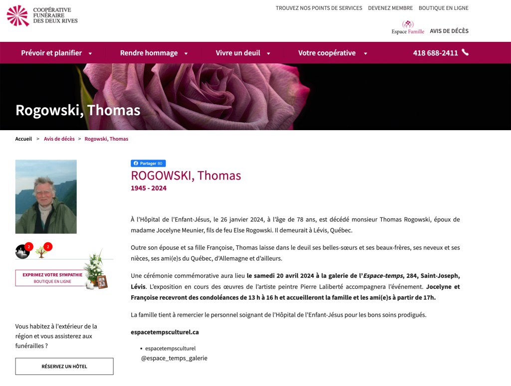 C’est avec beaucoup d’émotion et de tristesse que nous vous annonçons le décès de Thomas, conjoint de Jocelyne et un fidèle partenaire de l’Espace-temps culturel.