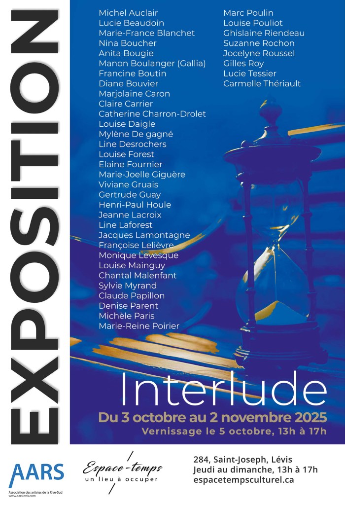 Lieu : Galerie de l’Espace-temps, 284, rue Saint-Joseph, Lévis